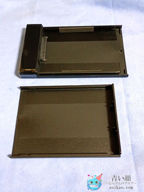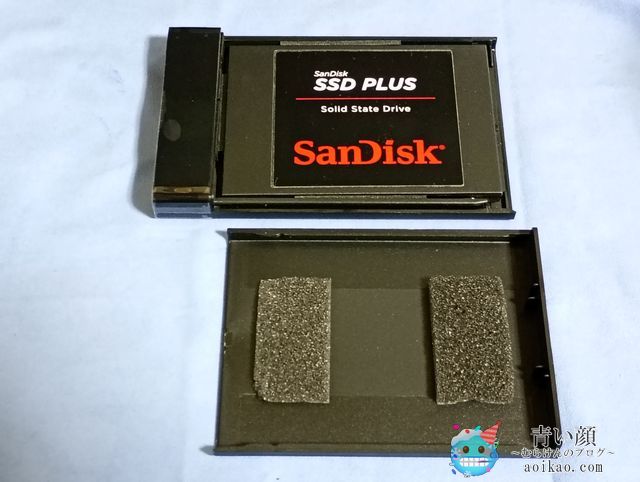 次にクッションですが、説明ではSSD本体に貼り付けることになっていますが、将来的に、内部のSSDを交換するかもしれないので、その時に備えて、SSD本体ではなく、蓋の裏側に貼り付けました。